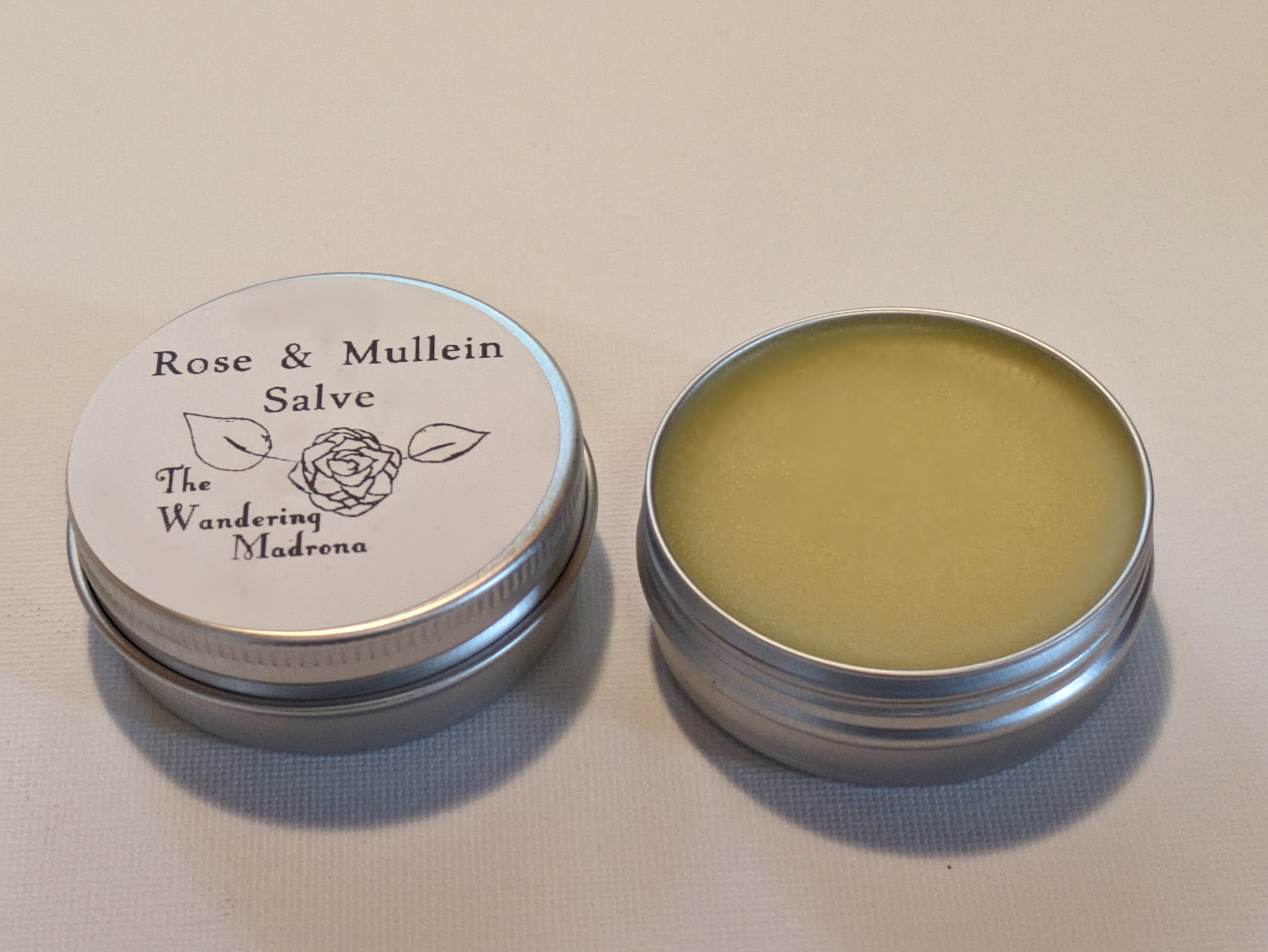 The Wandering Madrona Rose & Mullein Salve is made with organically and locally grown rose and mullein.